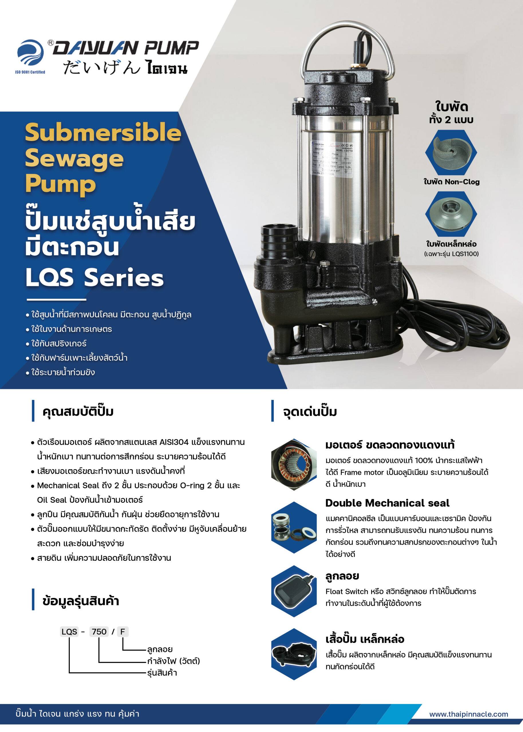 8. Mechanical seal 2 ชั้น O ring 2 ชั้น และ Oil seal ป้องกันน้ำเข้ามอเตอร์